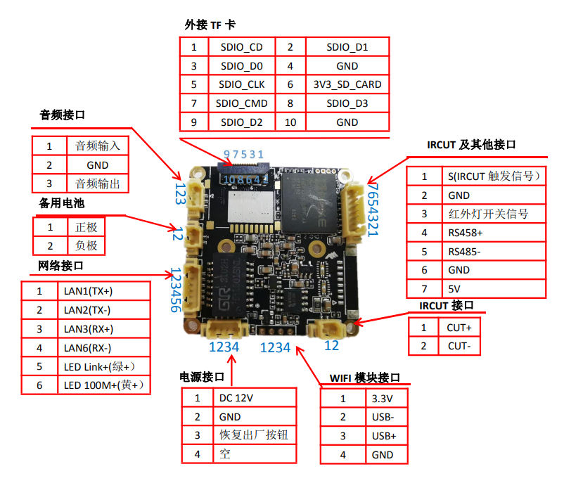 | 音频接口 | 板端不带功放电路,1路音频输入 1路音频输出 |